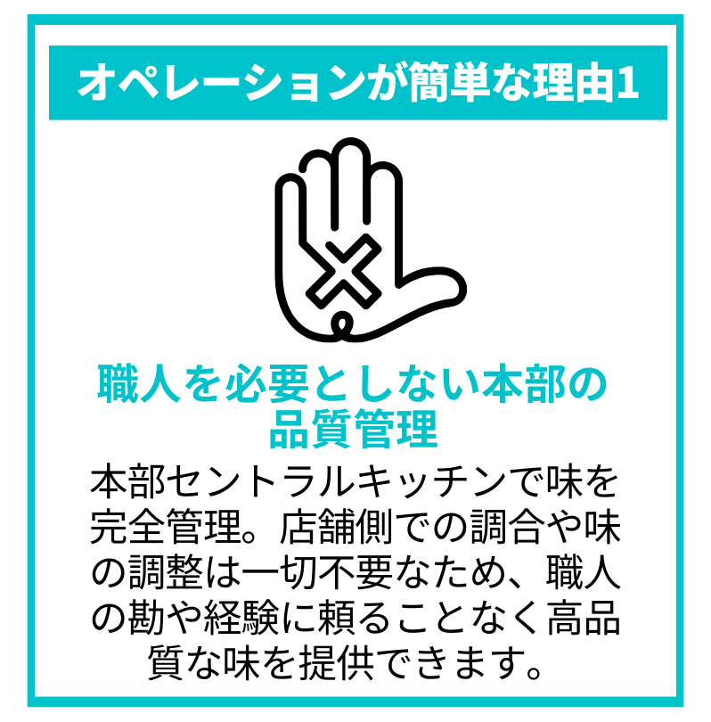 当社の『一口で違いがわかる本物の味』 は、本部のセントラルキッチンによって支えられています。本部が一括管理・調整した高品質な味を全国のパートナー企業により直送し、各店舗が完全再現できるため、店舗側での『職人』は一切不要です 。『丸型口金』 を含む独自オペレーションと組み合わせることで、アルバイトスタッフでも本店の味を完全に『再現』できる仕組みこそが、当社の模倣困難な商品力です。