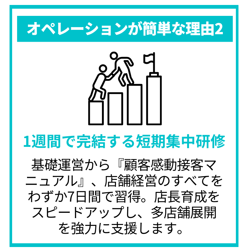 【研修】: オーナー様(または店長候補)には、本部にて合計7日間の研修を受けていただきます。統一資材を活用した『非職人』オペレーションと、『顧客感動接客マニュアル』 の習得、店舗運営の基礎知識を学びます。最終認定試験の合格が開店の条件です。