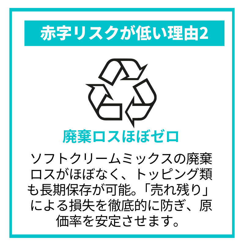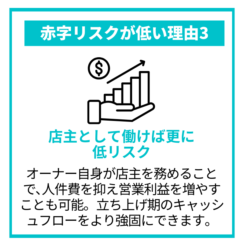 廃棄ロスがほぼゼロで無駄なコストが発生しにくく、損益分岐点が90〜100万円と低いため、毎月の赤字リスクが低いです