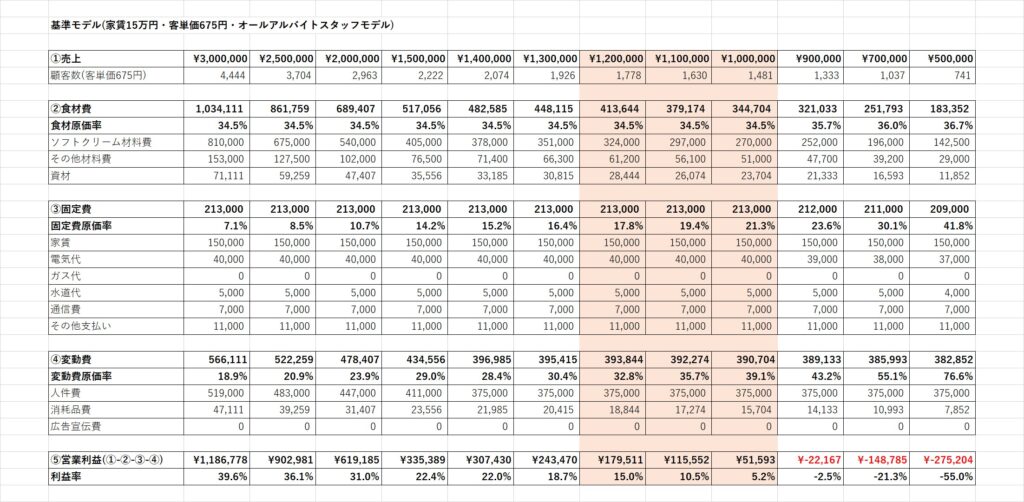 家賃が15万円、運営はアルバイトスタッフだけの場合の損益シュミレーションです。